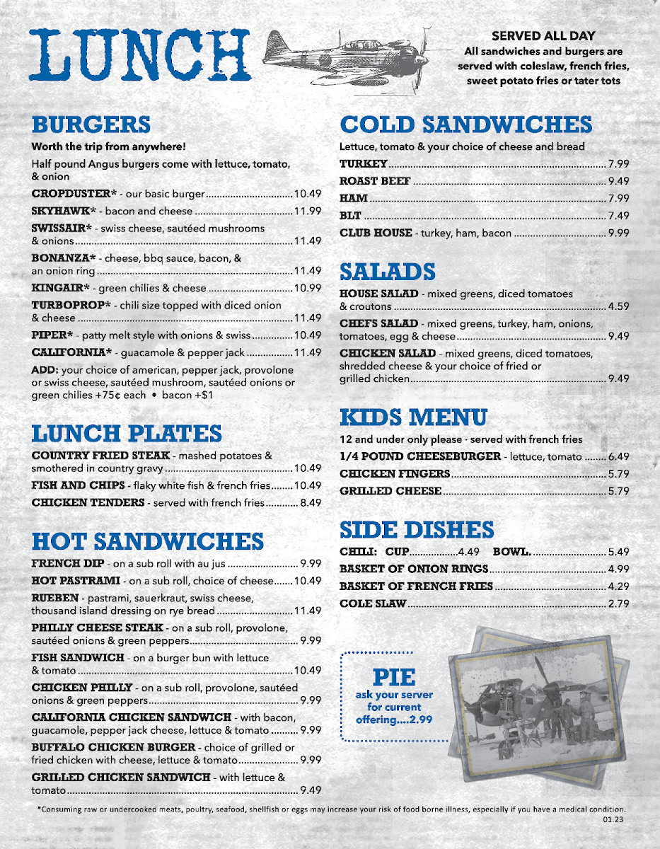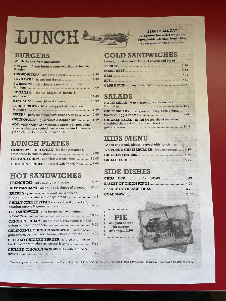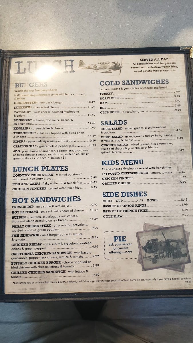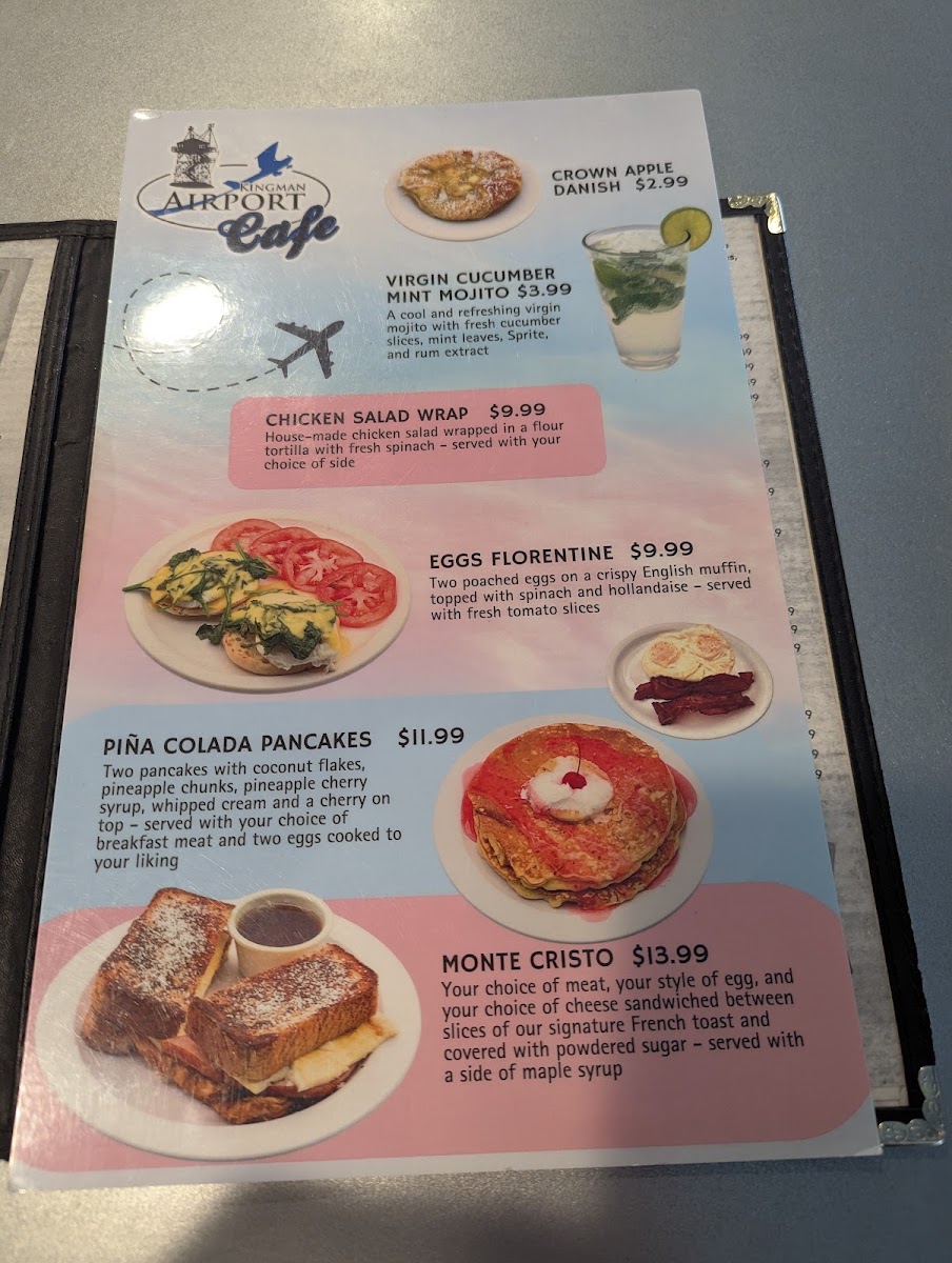 If you're in the mood for a laid-back yet tasty meal, the Kingman Airport Cafe Menu offers a variety of options to satisfy any craving. Nestled at 6000 Flightline Dr, Kingman, AZ, the café delivers everything from hearty breakfast dishes to satisfying lunch options, all served in a cozy, welcoming atmosphere. Whether you're stopping by after a flight or just exploring the area, the menu has something for everyone. Try one of their signature sandwiches or enjoy a comforting homemade soup - the food is always fresh and full of flavor. Don’t forget to grab a hot cup of coffee or a refreshing drink to go along with your meal. With friendly service and a menu that’s sure to hit the spot, it's the perfect place to fuel up before or after your adventures in Kingman.